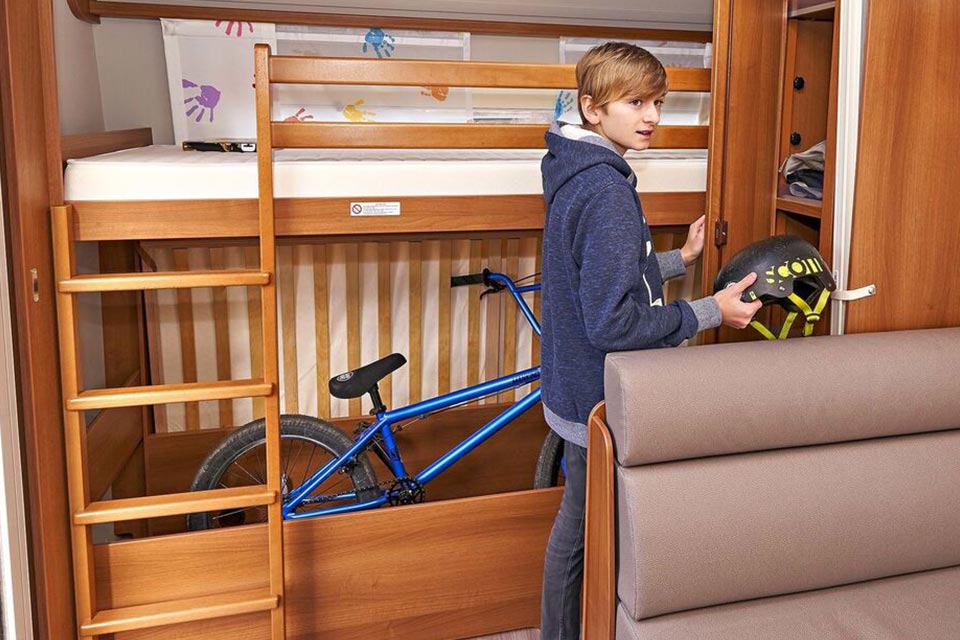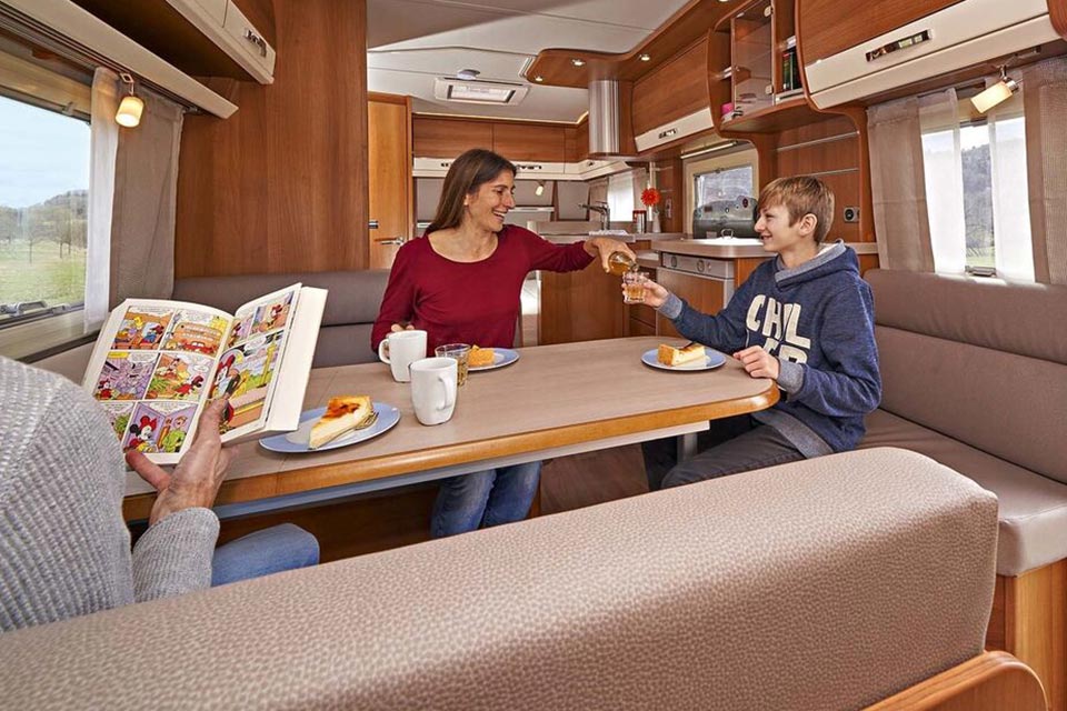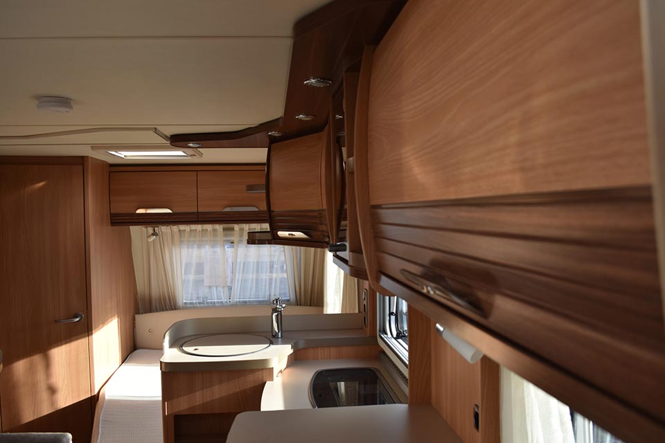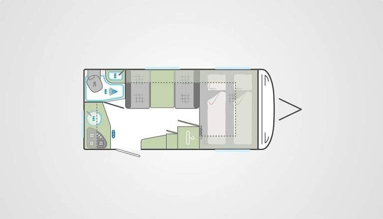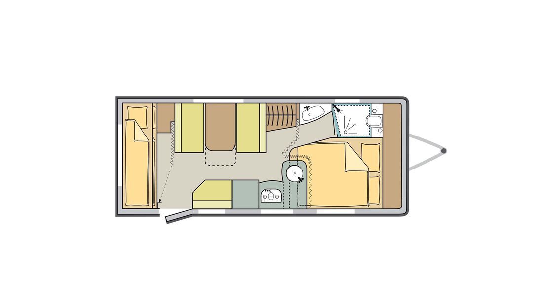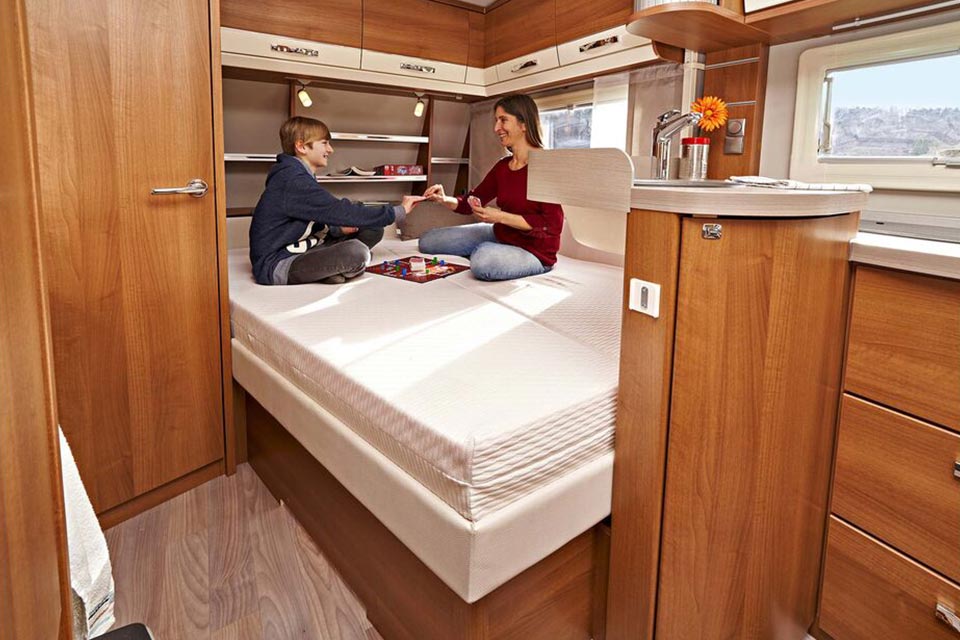 - Zwei Schlafplätze im Festbett, nach Umbau der Sitzgruppe können zwei weitere Schlafplätze hinzugefügt werden.