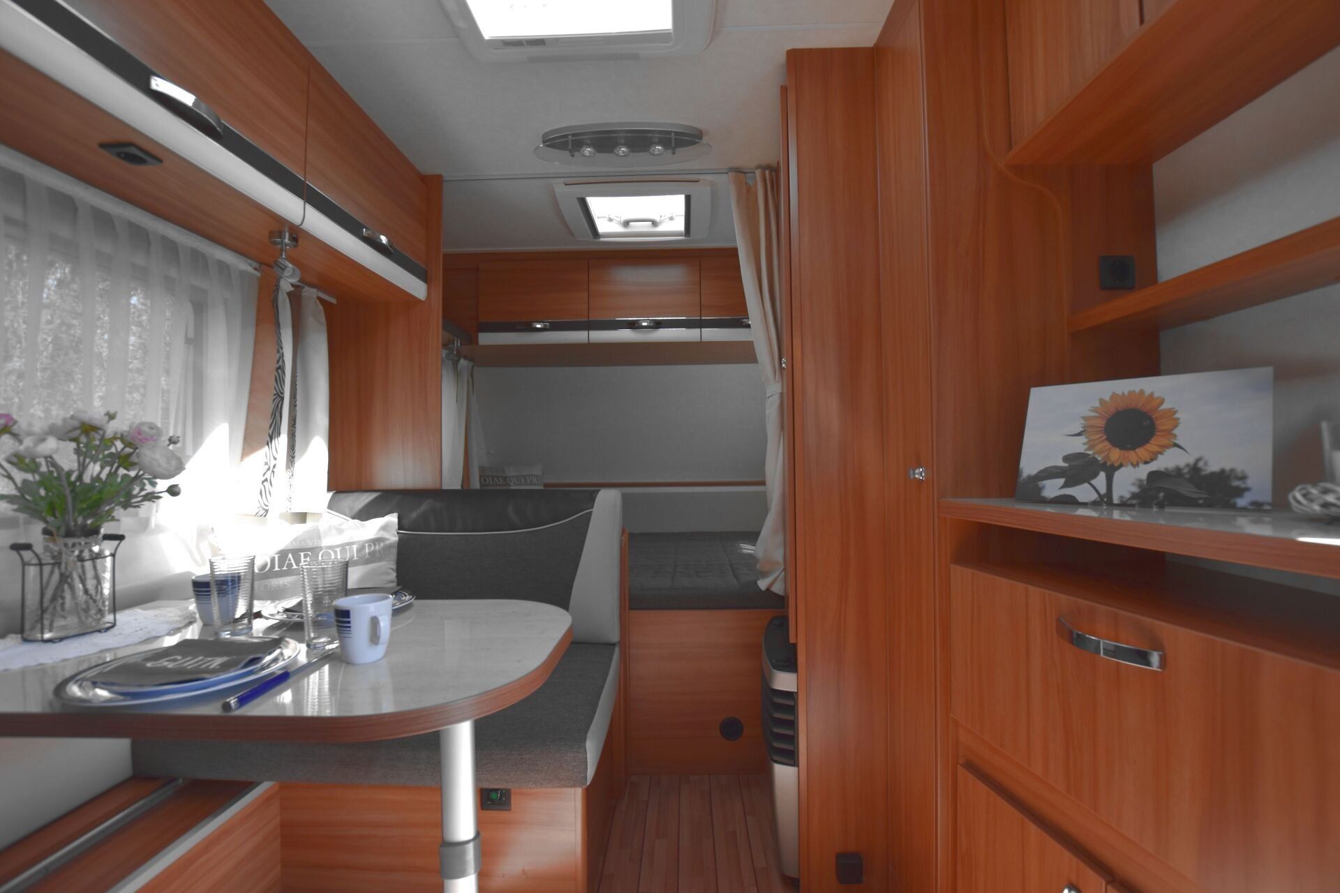 - Zwei Schlafplätze im Festbett, nach Umbau der Sitzgruppe können zwei weitere Schlafplätze hinzugefügt werden.